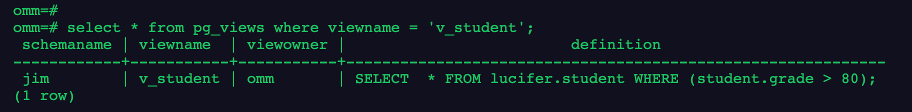create view lucifer.v_student as select * from lucifer.student where grade > 80;