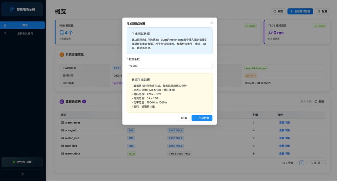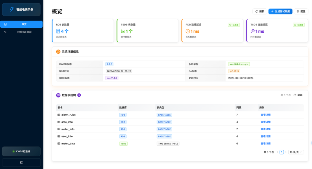项目:它模拟了 KWDB 在智能电表场景下的典型应用,包含了完整的数据表结构(关系型与时序型)和海量模拟数据。