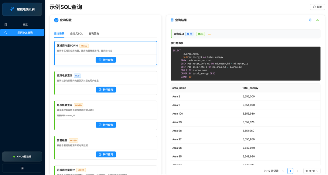 查询示例:示例 SQL 查询页面内置了丰富的查询场景示例,涵盖了 Smart Meter