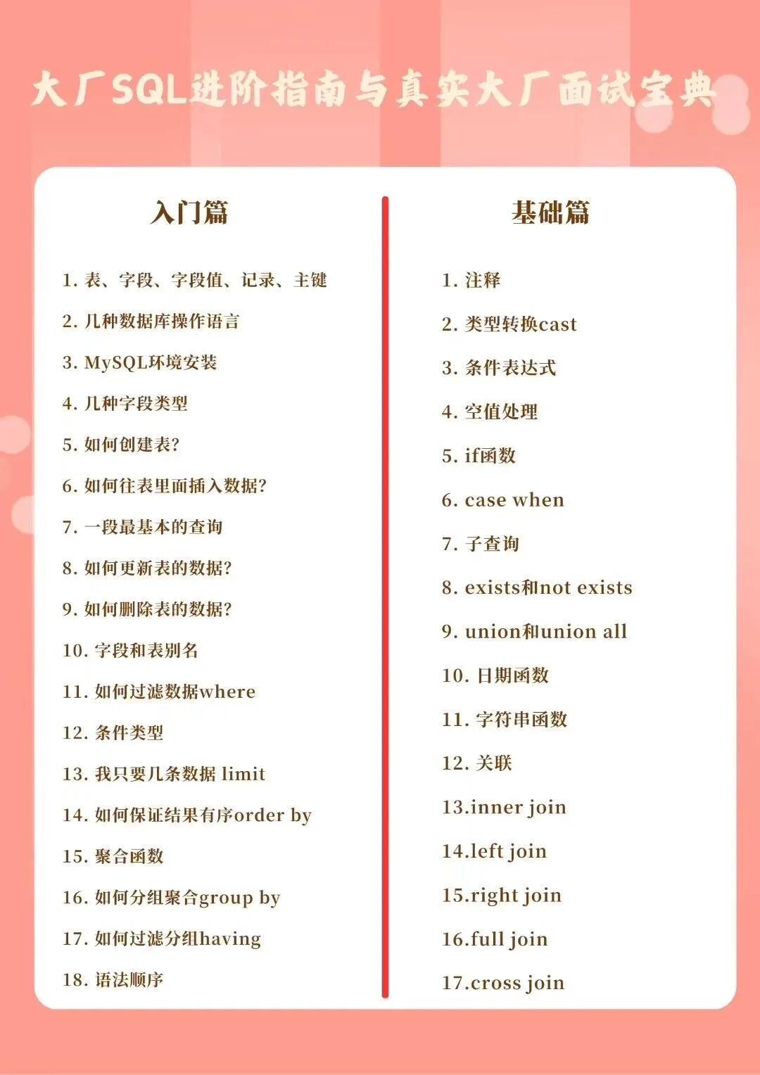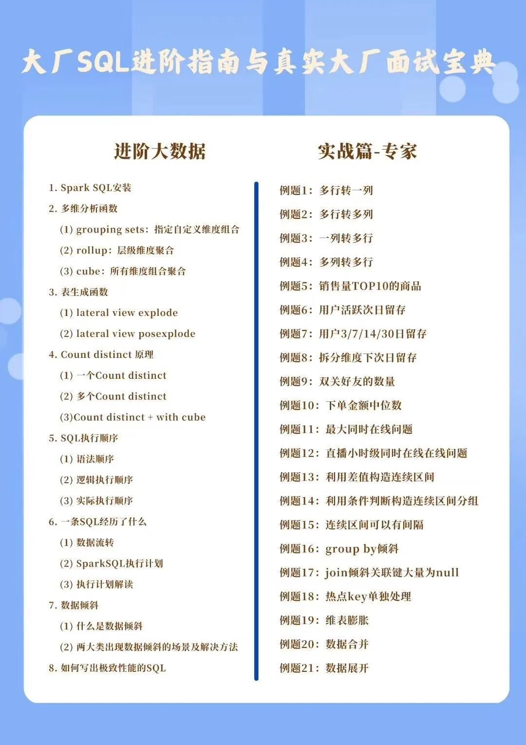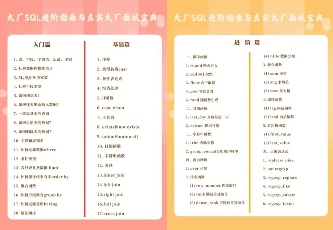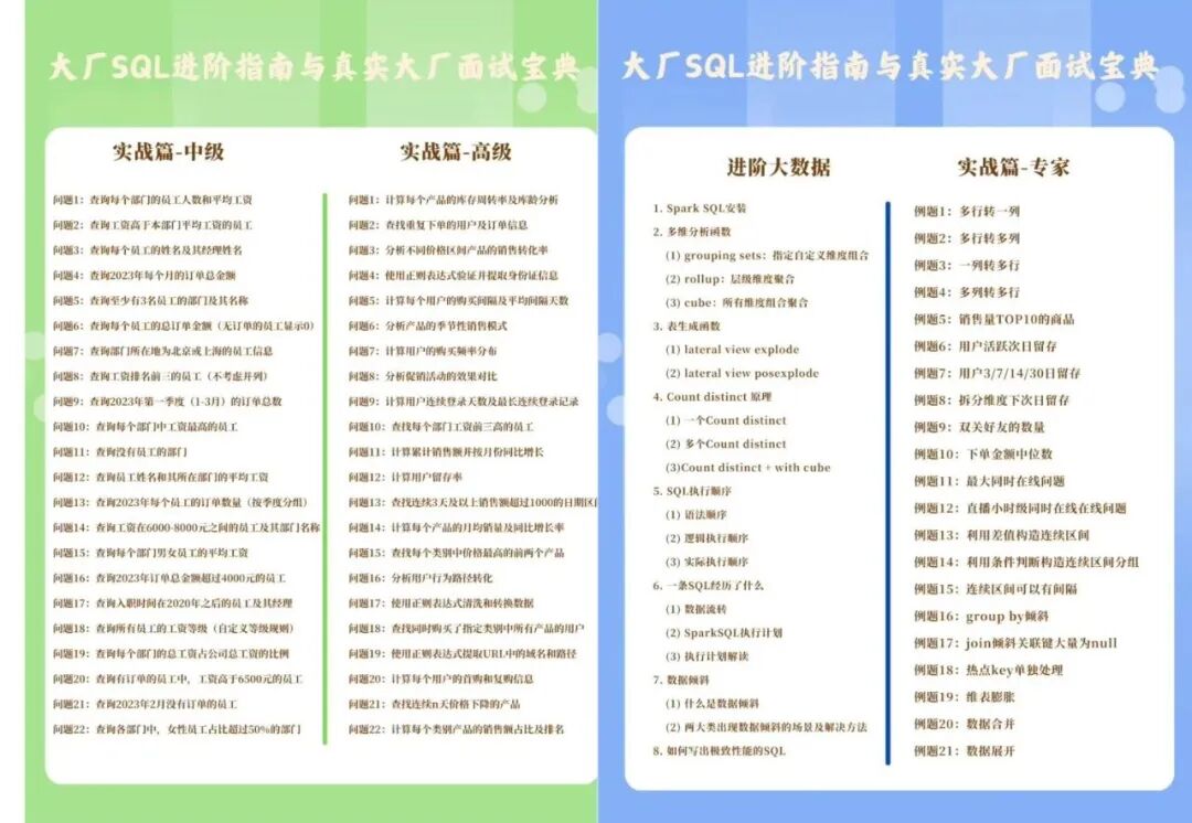 有取数诉求的「SQL小白」快速入门,轻松上手取数任务。 「SQL新手」可以进一步进阶,应对工作或面试场景。 「SQL高阶」进一步进阶,轻松解决真实大厂面试题目。