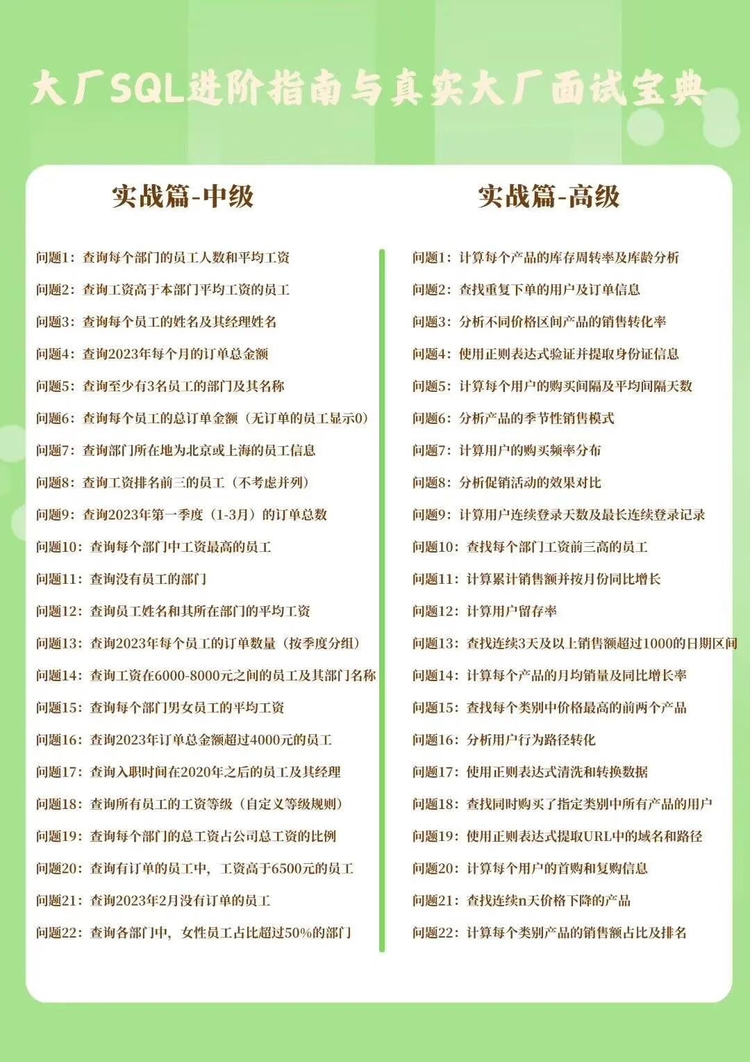 课程过长&无重点实战题目单薄&非面试高频题目现在SQL课程大多和具体数据库耦合,真正教SQL的课程基本没有