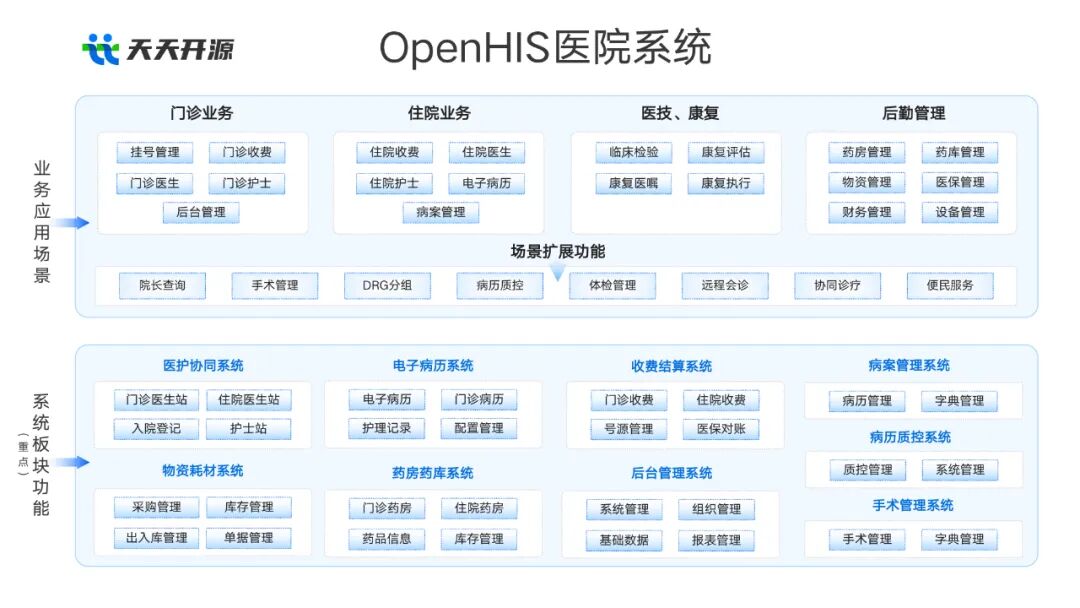 以 OpenHIS 医院系统(由天天开源提供)为例,其包含门诊、住院、医技、后勤、手术、病案、物资耗材等多个子系统,数据来源复杂,结构多样。若缺乏统一的数据治理与分析平台,医院将无法实现精细化运营、科学决策和绩效考核。