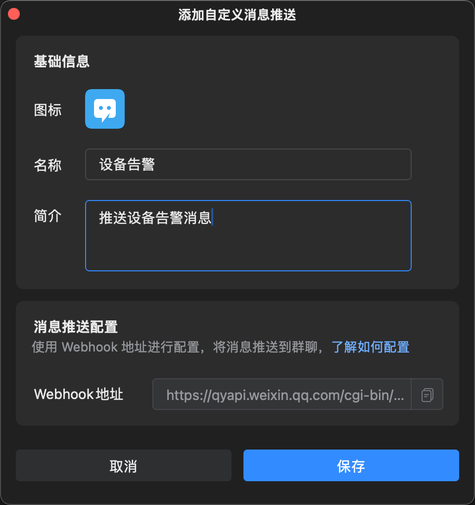 2. 成功添加消息推送后,系统会自动生成该机器人专属的 Webhook 地址,其格式如下: