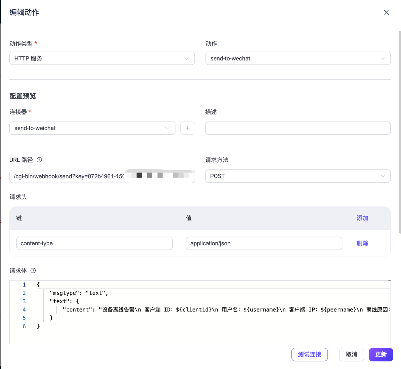 完成「事件触发规则配置」,在规则中添加消息转发动作,将通过规则 SQL 筛选出的离线消息数据,封装为符合企业微信消息推送要求的消息格式,并推送至指定的企业微信群,实现离线告警消息的自动化推送。