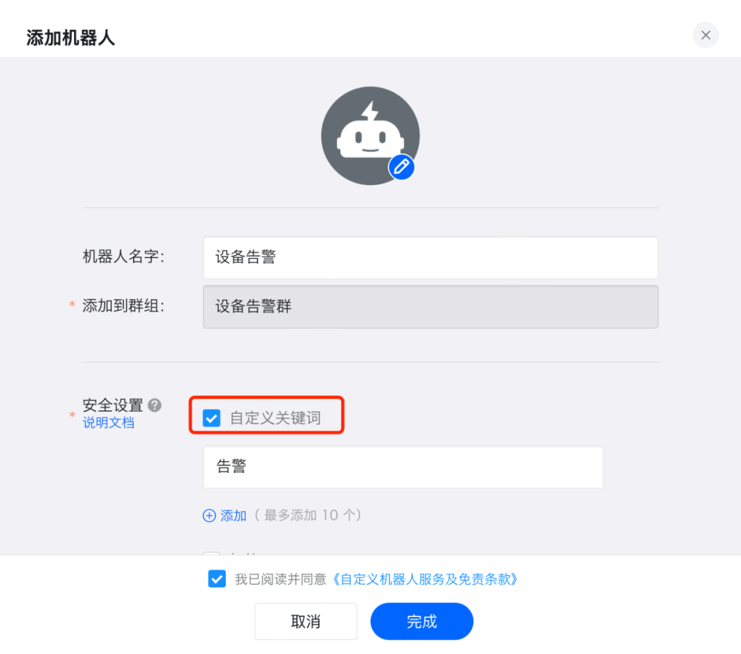 此处输入自定义关键词「告警」,其具体作用机制如下:当操作者获取到机器人对应的 Webhook URL 后,仅在发送的消息内容中包含「告警」这一预设关键词时,该消息才能够成功在目标群聊内发布。