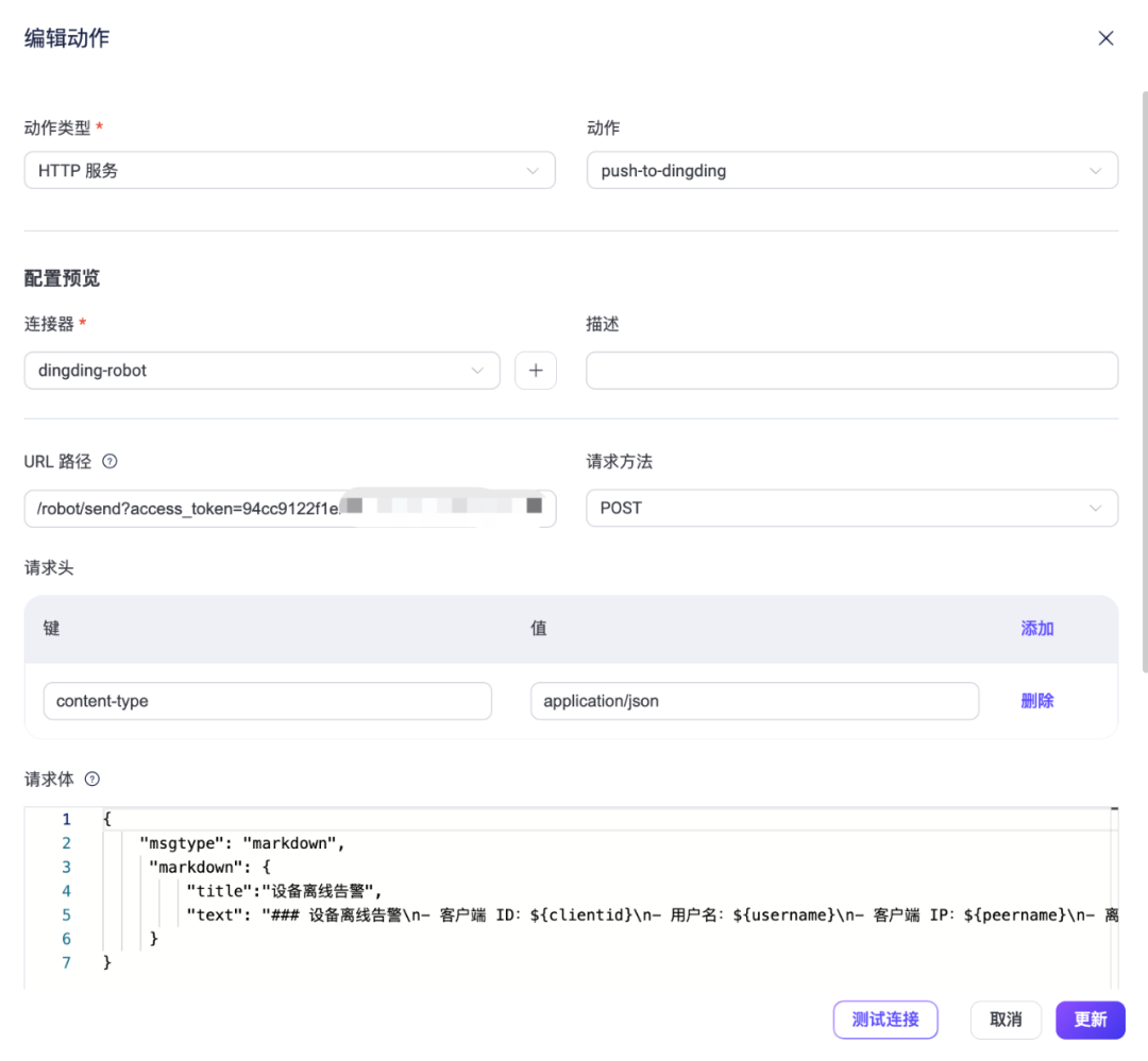 完成「事件触发规则配置」,并在规则中添加消息转发动作,将通过规则 SQL 筛选出的离线消息数据封装为符合钉钉机器人要求的消息格式,并推送至指定的钉钉群聊,实现离线告警消息的自动化推送。