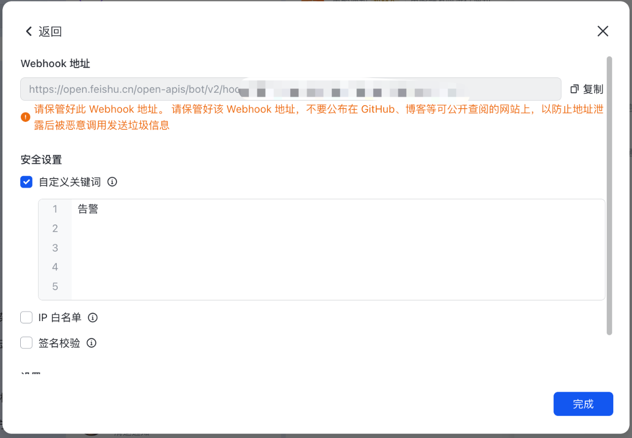 此处同样输入自定义关键词「告警」,成功添加目标机器人后,系统会自动生成该机器人专属的 Webhook 地址,其格式如下: