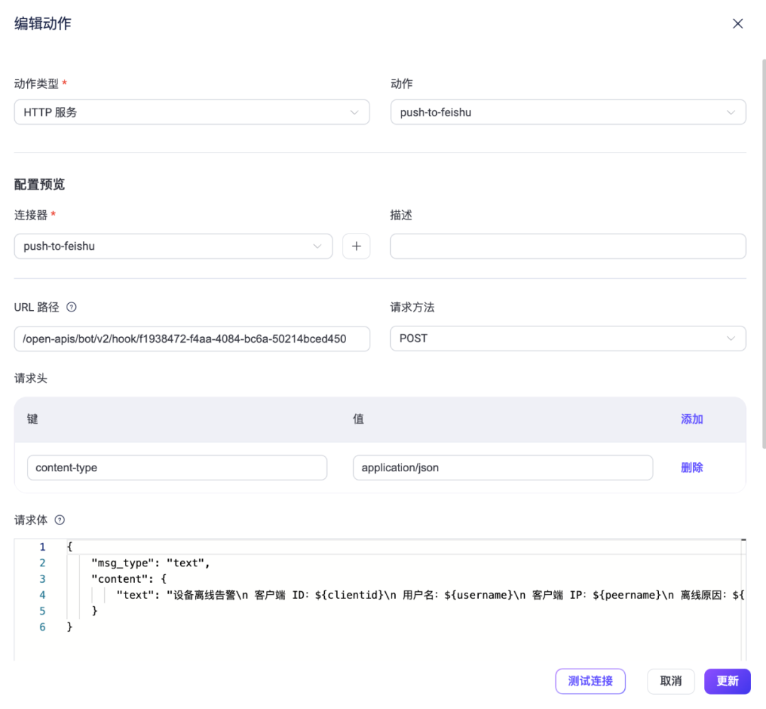 参考上文完成「事件触发规则配置」。在规则中添加消息转发动作,将通过规则 SQL 筛选出的离线消息数据封装为符合飞书机器人要求的消息格式,并推送至指定的飞书群聊,实现离线告警消息的自动化推送。