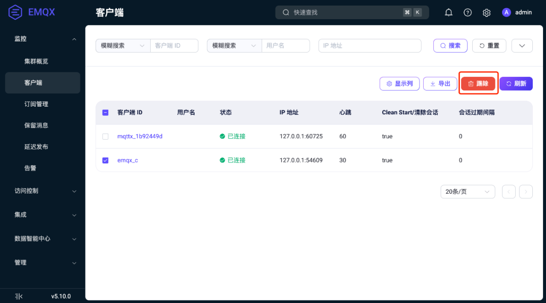 3. 在列表中选中刚刚建立连接的 MQTT 客户端,点击 踢除 按钮。对于这个操作,选中客户端将被 EMQX 断开并因此触发断开连接事件,事件的原因为 kicked。