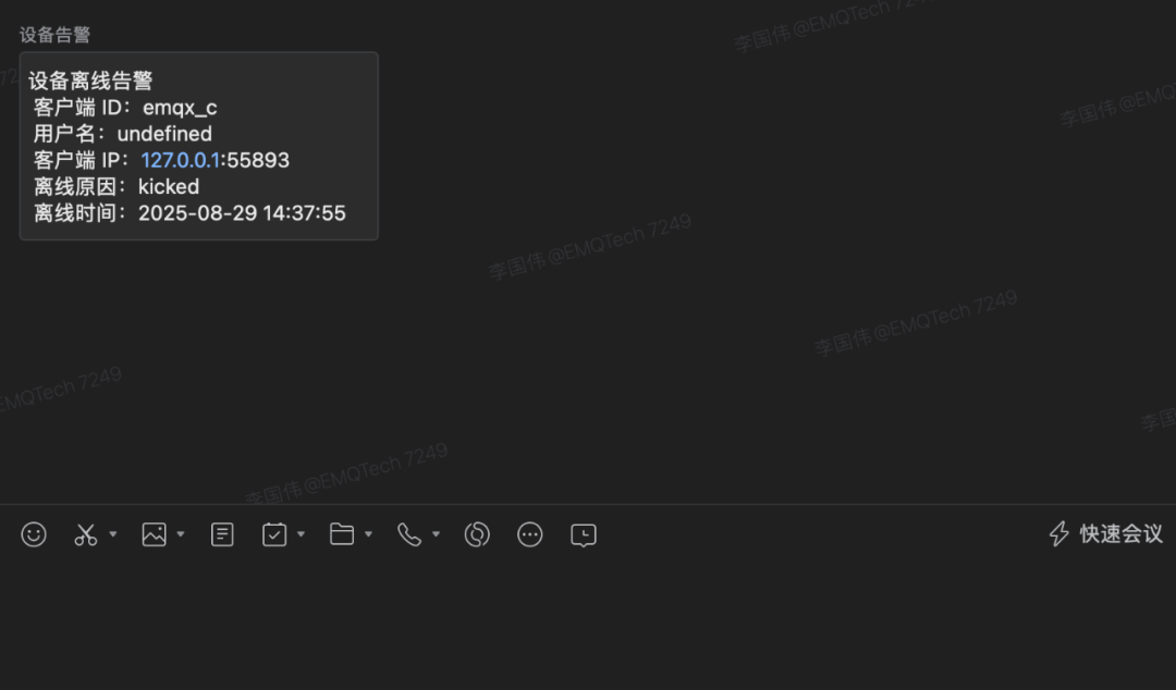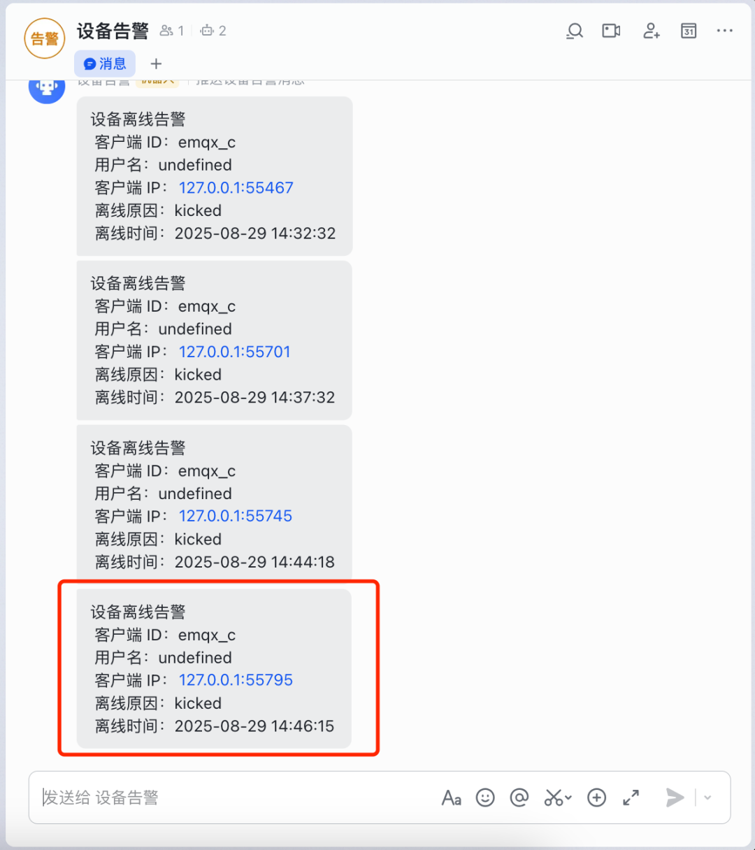 通过以上内容,我们验证了 EMQX 可稳定将设备离线告警消息实时推送至企业微信、钉钉、飞书等常用协作平台。