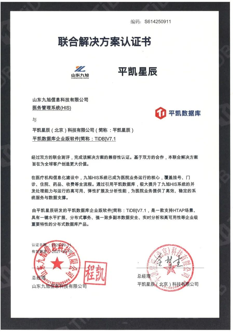 山东九旭信息科技有限公司负责人表示:“九旭始终致力于为医疗机构提供先进的医院信息化解决方案。此次与平凯星辰的合作,将我们在医疗信息化领域的深厚积累与平凯数据库的强大数据管理能力结合,为客户打造了更安全、更高效的系统平台,为行业发展注入了新动力。”