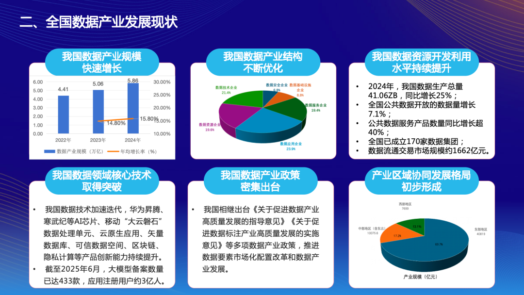 《报告》显示当前全球数据产业正呈现出蓬勃发展的良好局面,具体表现为数据产业规模快速增长、数据产业业态不断衍生、数据技术加快创新突破,以及数据安全治理制度不断健全愈发完善健全。对我国数据产业从规模快速增长、数据产业结构不断优化、数据资源开发利用水平持续提升、数据领域核心技术取得突破、数据产业政策密集出台,以及产业区域协同发展格局初步形成等多个维度进行了全面解读。《报告》更结合丰富的图表数据,对北京市当前的数据产业发展状况进行了生动详实的分析,使大家能够更加直观、清晰地把握相关发展情况。