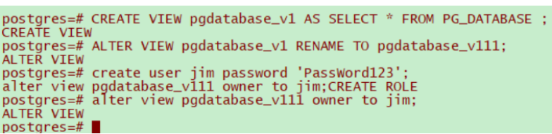 1.为系统表PG_DATABASE创建视图,重命名视图并修改owner为jim,