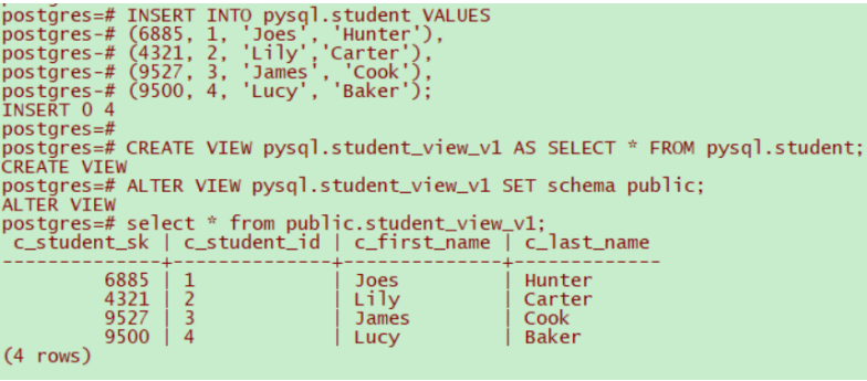2.创建一个用户表student,并在用户表上创建视图,修改视图schema;