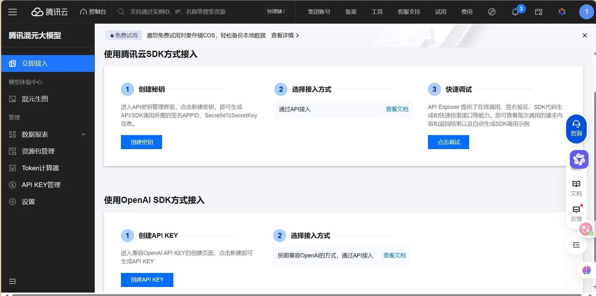 1. 获取混元大模型的 API Token(腾讯SDK有SecretId 和 SecretKey,openai SDK则为"sk-...."),前往腾讯云控制台申请,参考混元大模型官方文档。