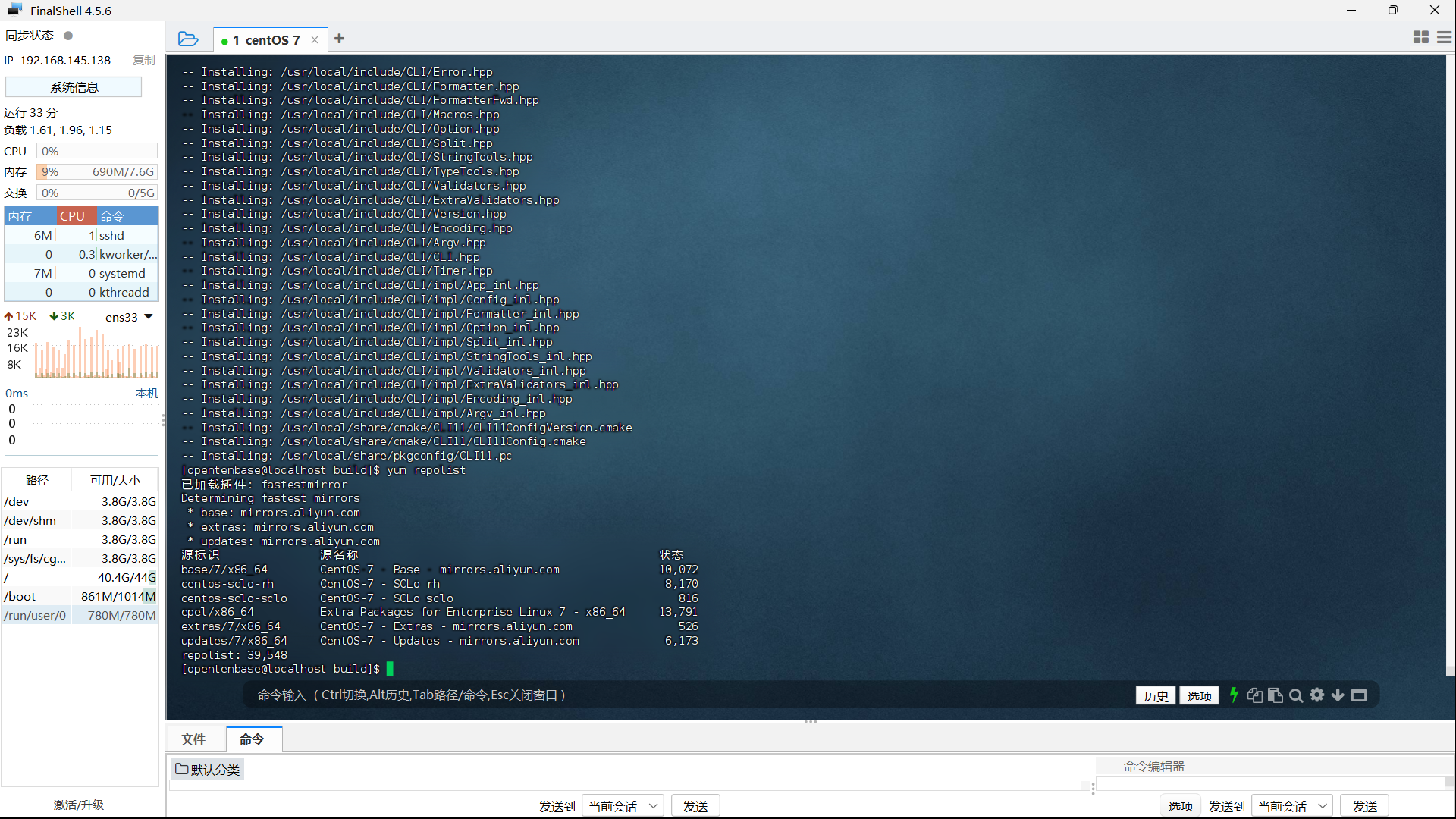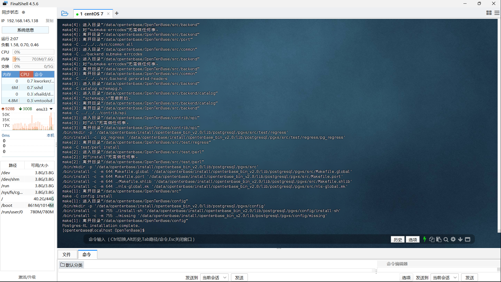 在实际操作过程中,我们以 CentOS 7 为基础平台,系统完成了依赖库安装、许可证合规处理、源码编译与链接等关键环节,成功生成 OpenTenBase 5.0 可执行程序。随后完成了单机环境下多节点集群的初始化与启动,通过精准配置全局事务管理器(GTM)、协调节点(CN)及数据节点(DN)的角色与通信参数,有效确保了集群内部的事务一致性与服务稳定运行。