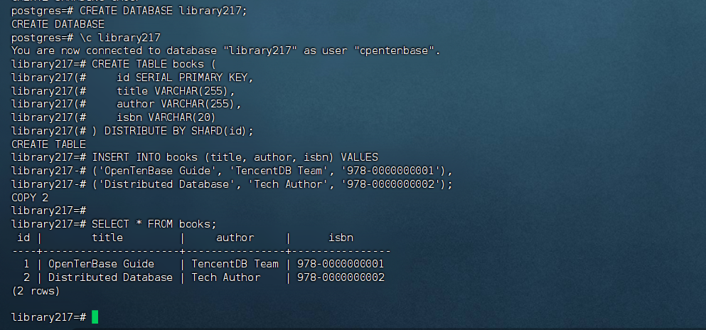 ('OpenTenBase Guide', 'TencentDB Team', '978-0000000001'),