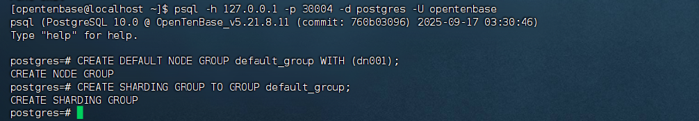 psql -h 127.0.0.1 -p 30004 -d postgres -U opentenbaseOpenTenBase使用数据节点组来增加节点管理的灵活性。需要创建一个默认组来使用,因此需要提前创建。通常,所有数据节点都会被添加到默认组中: