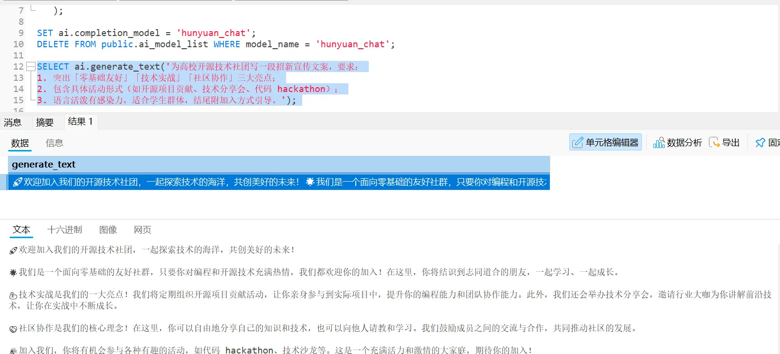 opentenbase_ai 插件为 PostgreSQL 数据库提供了集成人工智能大语言模型能力的接口,让您能够直接在 SQL 中使用 AI 功能。该插件支持多种 AI 模型提供商(包括 OpenAI、DeepSeek、腾讯混元、阿里通义千问等),提供文本生成、翻译、情感分析、问答提取、文本摘要、嵌入向量生成以及图像分析等功能。