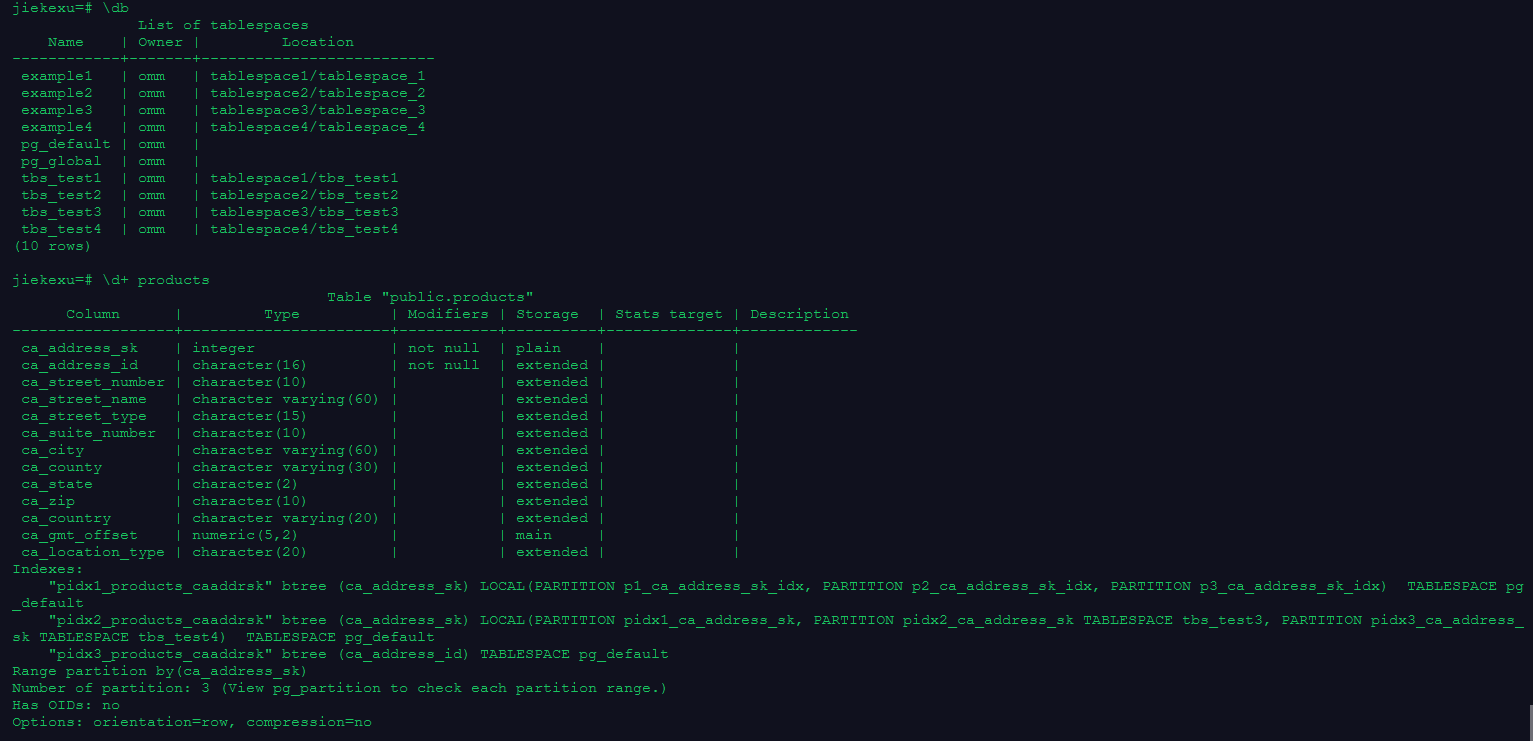 "pidx2_products_caaddrsk" btree (ca_address_sk) LOCAL(PARTITION pidx1_ca_address_sk TABLESPACE tbs_test1, PARTITION pidx2_ca_address_sk TABLESPACE tbs_test3, PARTIT