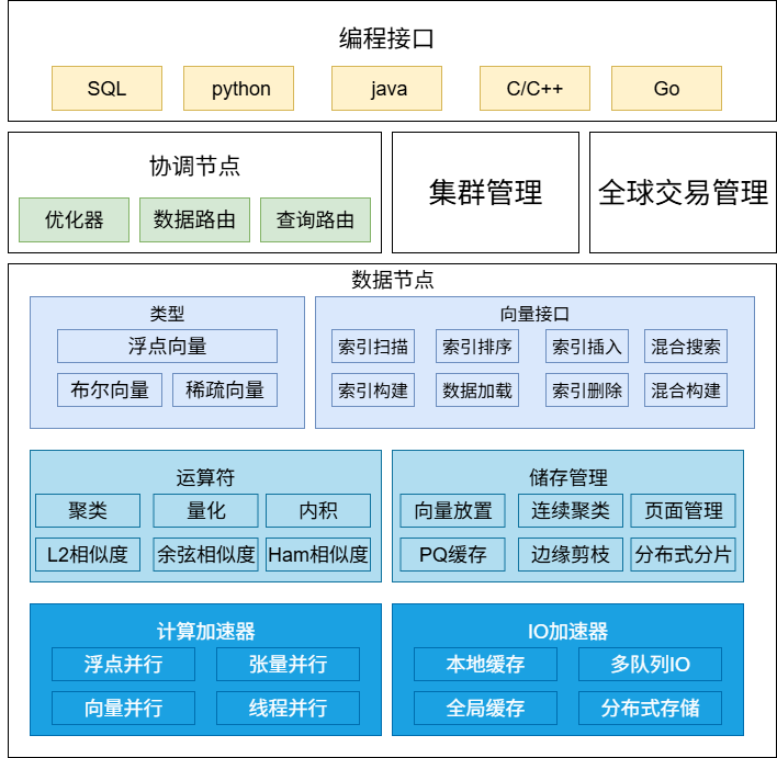 · 存储管理器:系统性能的基石是其基于页面的存储管理器。为了最大化I/O效率,它将距离相近的向量在物理上聚集存储,从而最小化随机磁盘读取。向量数据与其它关系型列一同以行存格式存储,实现了无缝集成。系统支持为向量和标量列构建索引,以加速查询。