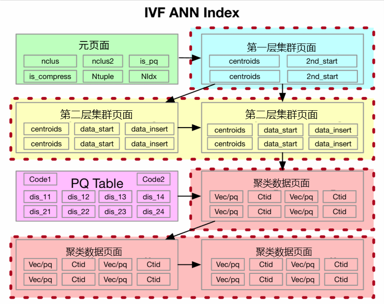 o 索引构建:通过蓄水池抽样采集样本,进行k-means聚类构建聚类页,然后扫描全量数据,按聚类ID排序后顺序构建数据页,确保物理存储的连续性。