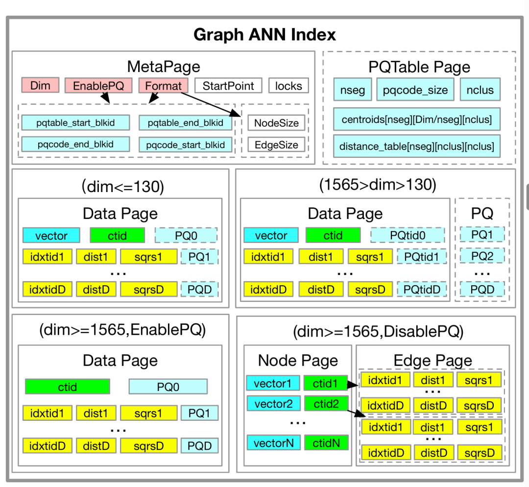 1. 低维向量(dim≤130):将一个节点的向量、PQ编码及其所有邻居节点的PQ编码共同存储在同一个数据页上。这种数据协同定位(co-location)策略,使得一次磁盘读取就能获取图遍历下一步所需的所有信息,极大地减少了随机I/O次数。