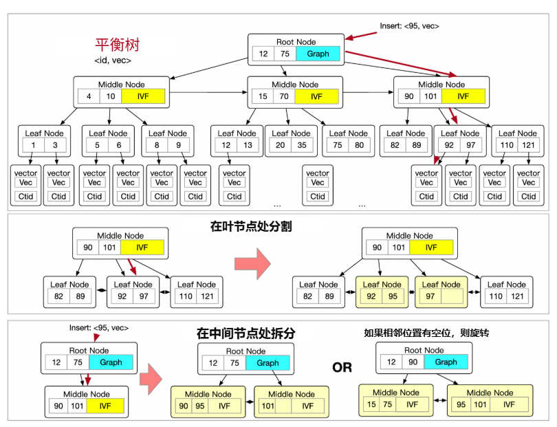 · 混合索引结构:该结构的核心是一个构建在标量属性上的平衡树(B-Tree)。其精妙之处在于,每个非叶子节点(根节点或中间节点)都内嵌了一个自己的向量子索引(可以是IVF或图索引),该子索引是基于其下所有子节点包含的向量数据构建的。