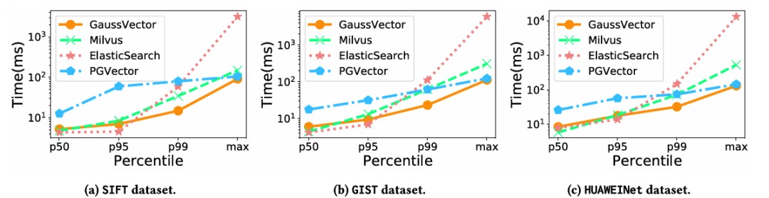 · 插入性能:在混合索引的插入性能测试中,GaussDB-Vector同样表现出具有竞争力的延迟,证明其设计在读写性能之间取得了良好的平衡。