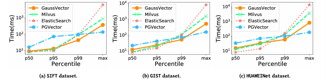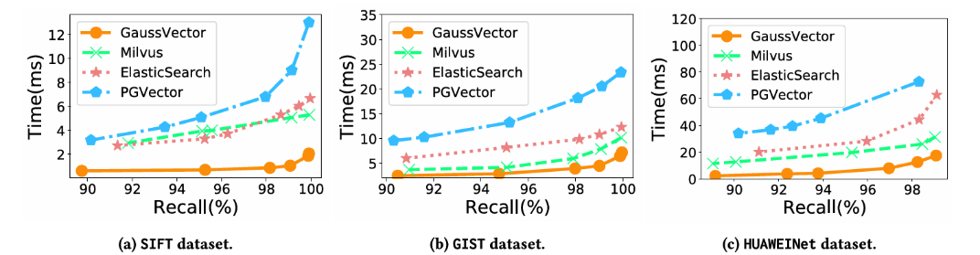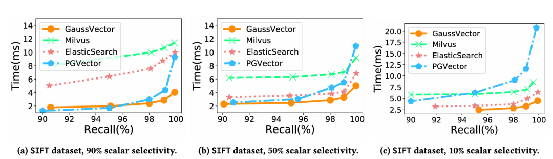 论文通过一系列详尽的实验,将GaussDB-Vector与Milvus、ElasticSearch和PGVector等主流系统进行了对比,全面验证了其设计优势。
