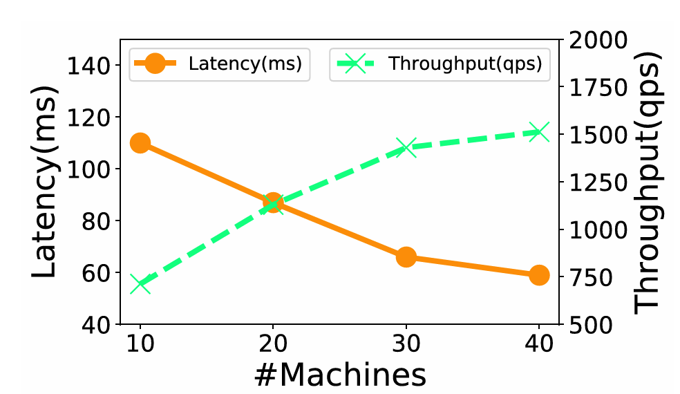 · 可扩展性:在100亿规模的SIFT-10B数据集上,分布式GaussDB-Vector展现出近乎线性的性能扩展能力。随着机器数量增加到40台,系统达到了99%的召回率、约60 ms的延迟和1,500 QPS的吞吐量,验证了其分布式架构和智能查询路由的有效性。