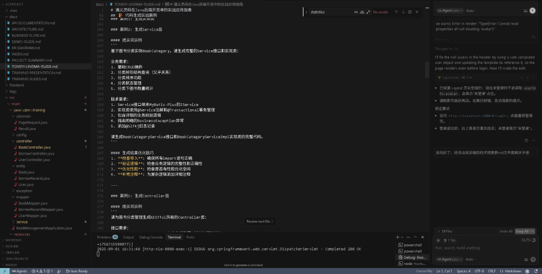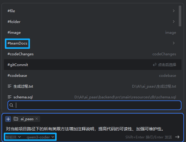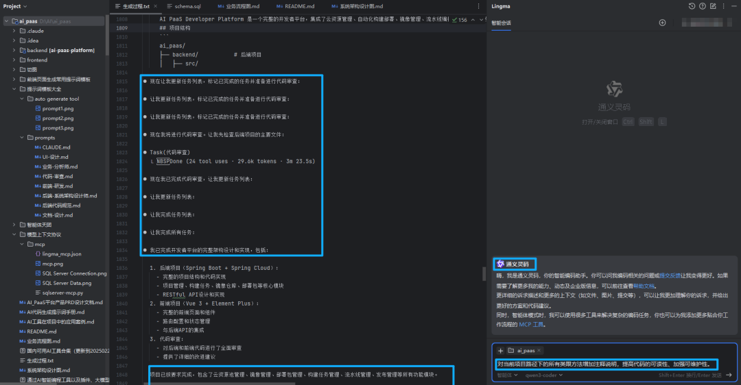 在创建好前后端工程的基础上,可以对局部代码或者某个模块的业务代码块加以深度查缺补漏,注释内容自动补全,提升代码的质量!