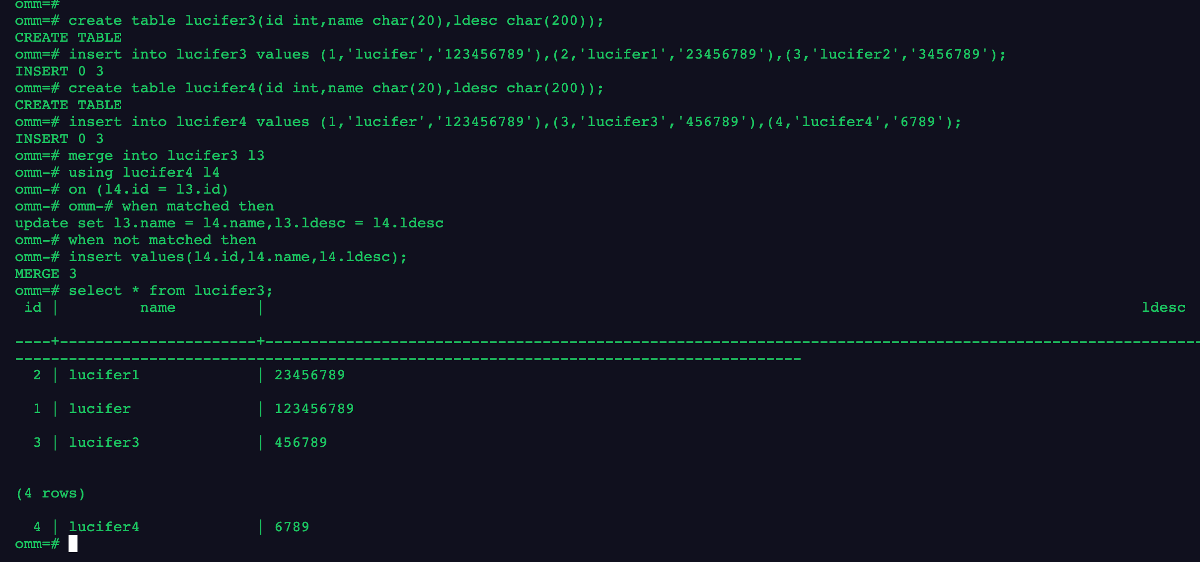 insert into lucifer4 values (1,'lucifer','123456789'),(3,'lucifer3','456789'),(4,'lucifer4','6789');