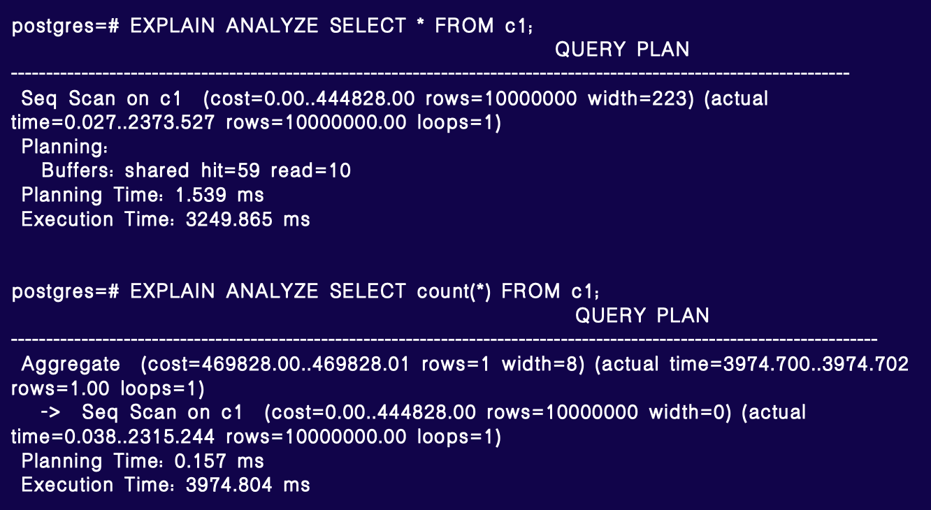 对于 count(*),总耗时约 4 秒,其中顺序扫描(SeqScan)耗时约 3.97 秒,占用了大部分时间。