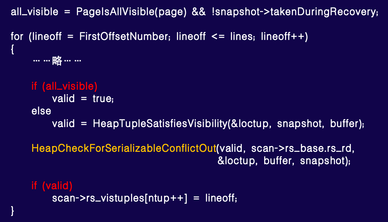 这是 PostgreSQL (Pg) 的一段代码,用于扫描一个数据块时,首先检查块首的 VM (visibility map) 是否标记为全可见,且通常不发生在恢复过程中。因此,在大多数情况下,如果表的 all_visible 比例较高或改动影响较小,代码可能跳到此处,相关逻辑基本无用。