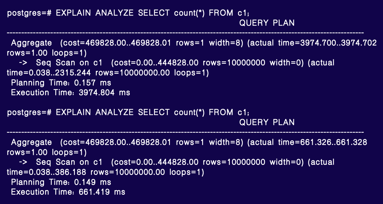 此改动目前不够优雅,优化器调整尚符合框架,但执行器改动较为生硬。不过,总算解决了用户问题。以 SELECT count(*) 为例,原始耗时约 4 秒,优化后在全可见理想状态下降至约 661 毫秒(约 1/6),极端情况下可达 10 倍提升,视缓存命中率而定。缓存命中率低时,优化效果更明显。