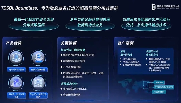 | 超高性能分布式集群 | 云原生数据库 TDSQL-B | 好用、能抗 | TDSQL Boundless,新一代企业级分布式数据库,提供极致的弹性和敏捷性,满足企业增长和规模带来的复杂度需求。作为 TDSQL 自研产品家族的新成员,在 2025 腾讯全球数字生态大会首次亮相。 | |