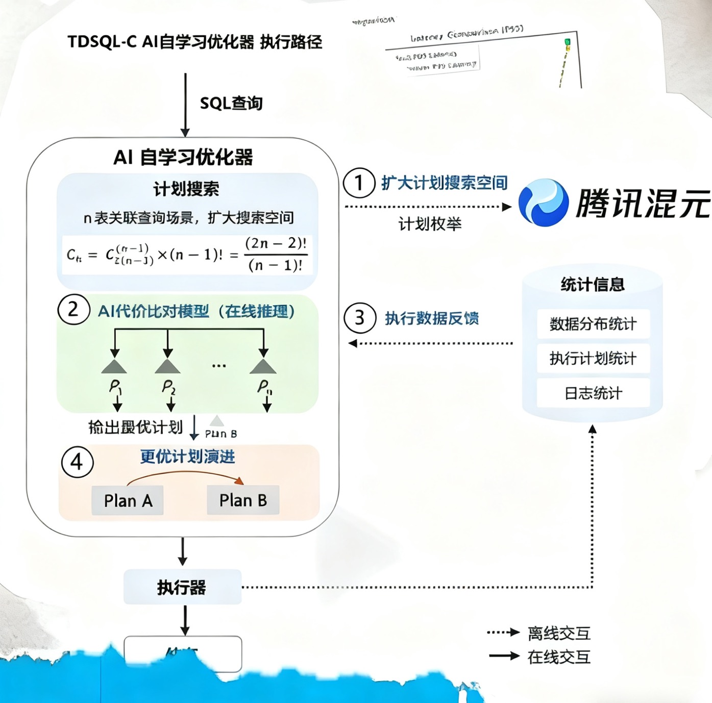 腾讯云的 AI 自学习优化器通过结合腾讯混元大模型,构建全链路优化能力,具备四大技术突破:一是全局探索最优执行计划,支持百亿级计划空间搜索;二是基于深度概率模型的可量化数据反馈,显著降低估算偏差;三是 AI 动态代价模型,能够更准确地评估执行计划质量;四是计划自学习演进机制,借助历史反馈实现“越用越准”。