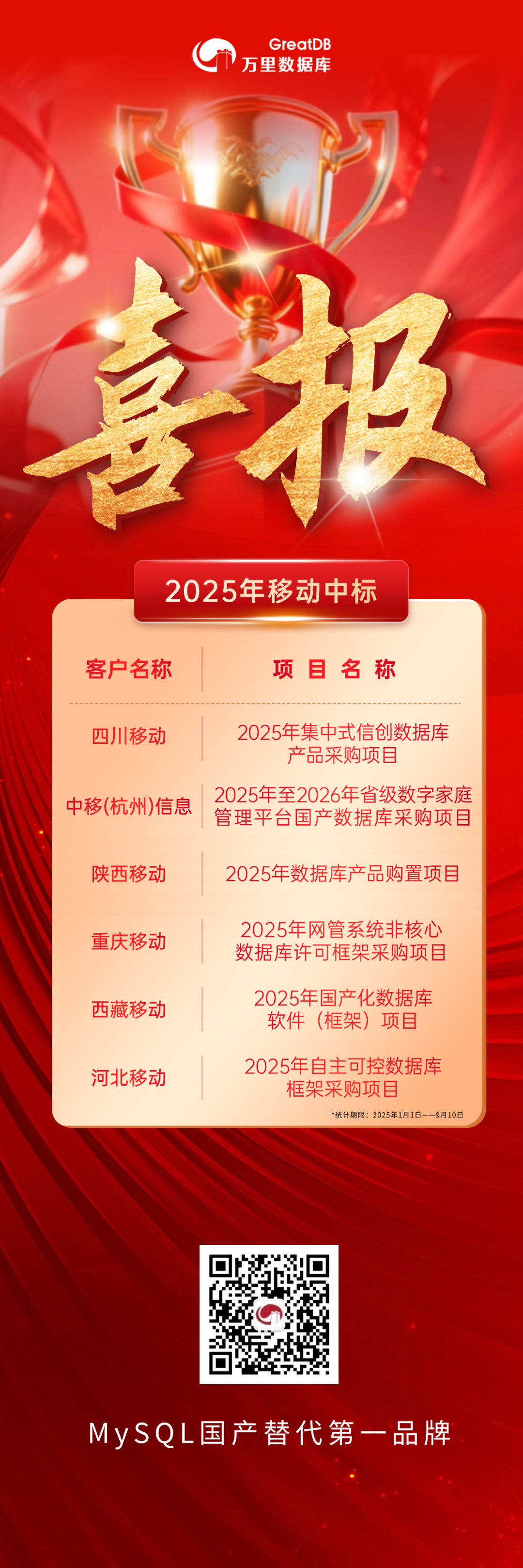 2025年,万里数据库在中国移动领域持续突破、捷报频传,累计斩获超千万元订单,深度赋能运营商数字化转型,展现出国产数据库领军企业的硬实力。