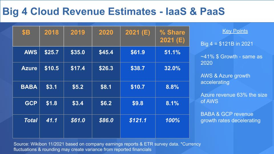 云计算四巨头收入增长及之间市场份额(不含其它云厂商)的比较,来源:Wikibon