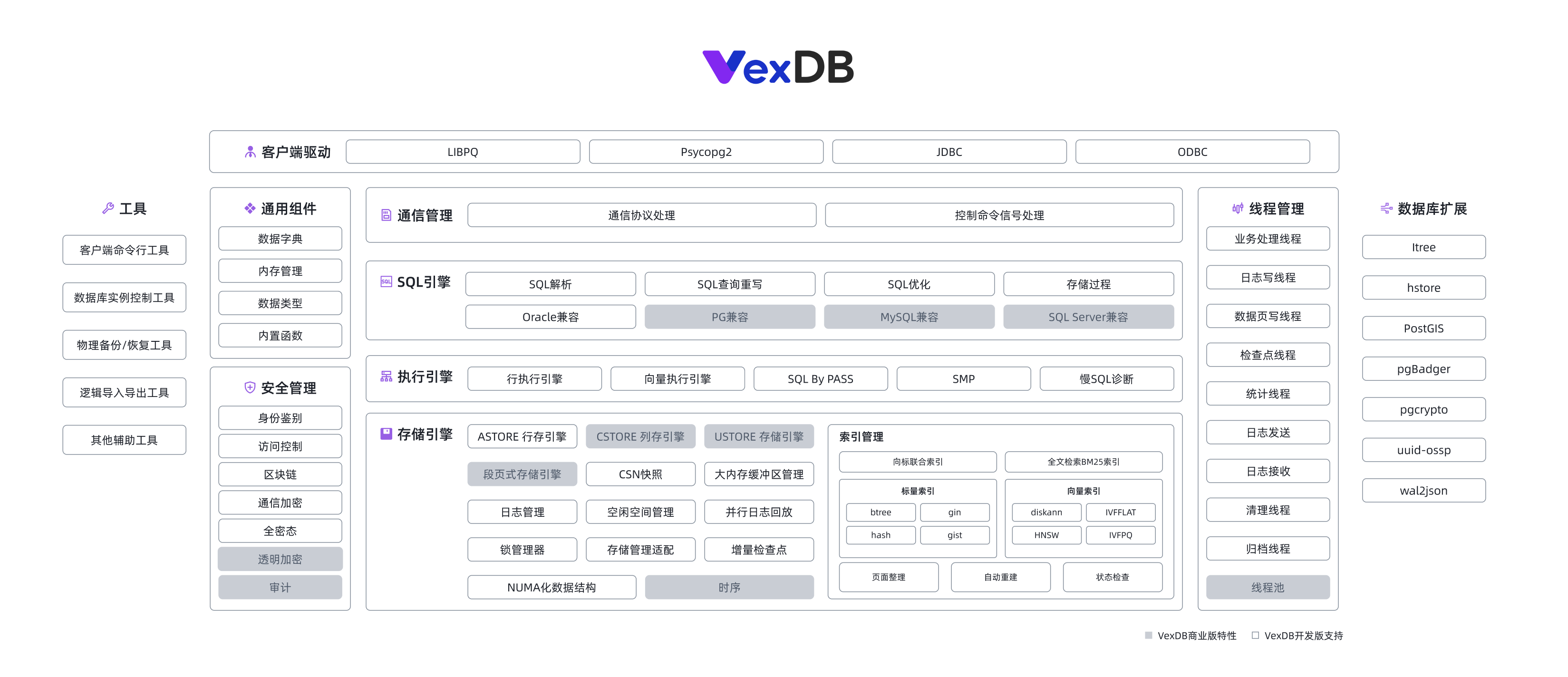 VexDB V3.0.0 把向量检索与关系型数据库相融合,支持多种高性能向量索引,能够同时满足结构化查询与语义检索的需求。在大模型、图像检索、推荐系统、搜索引擎等应用场景中,企业往往既需要对传统数据做精确查询,又需要对高维向量进行快速近似搜索。VexDB 将二者合一,既降低了系统复杂度和运维成本,又提升了检索效率与扩展性。对于希望在 AI 时代抓住机遇的用户而言,VexDB 提供了一条低门槛、高性能、可持续演进的数据库路径,是支撑智能应用的理想选择。