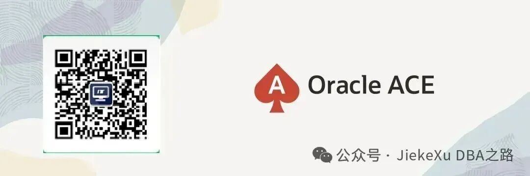 大家好,我是JiekeXu,江湖人称“强哥”,青学会MOP技术社区联合创始人,荣获Oracle ACE Pro称号,金仓最具价值倡导者KVA,崖山最具价值专家YVP,IvorySQL开源社区专家顾问委员会成员,墨天轮MVP,墨天轮连续多年年度“墨力之星”,拥有Oracle OCP/OCM认证,MySQL 5.7/8.0 OCP认证以及金仓KCP、KCM、KCSM,PCTA等众多国产数据库认证证书。欢迎点击下方“JiekeXu DBA之路”公众号名片可关注我的微信公众号,然后点击右上方三个点“设为星标”置顶,更多干货文章才能第一时间推送给你!后台回复【加群】,添加我个人微信拉你进群一起交流学习。