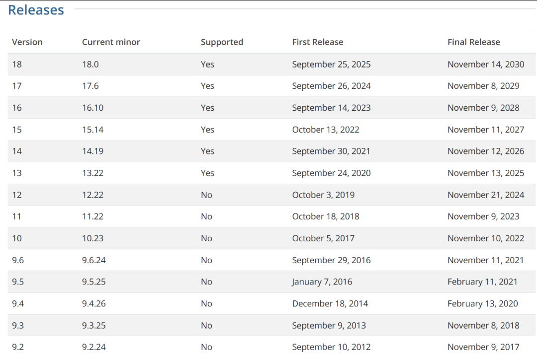 PostgreSQL 全球开发小组于 2025 年 9 月 25 日宣布发布 PostgreSQL 18,这是全球最先进的开源数据库的最新版本,基本上每年的 9 月底均会发布新版本,如今已发布 PG18 了,PG18 生命周期到 2030 年 11 月 14 日,今天让我们来看看 Release Notes 都有啥。