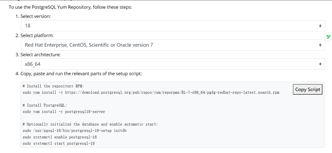 sudo yum install -y https://download.postgresql.org/pub/repos/yum/reporpms/EL-7-x86_64/pgdg-redhat-repo-latest.noarch.rpmsudo yum install -y postgresql18-serversudo /usr/pgsql-18/bin/postgresql-18-setup initdbsudo systemctl enable postgresql-18sudo systemctl start postgresql-18