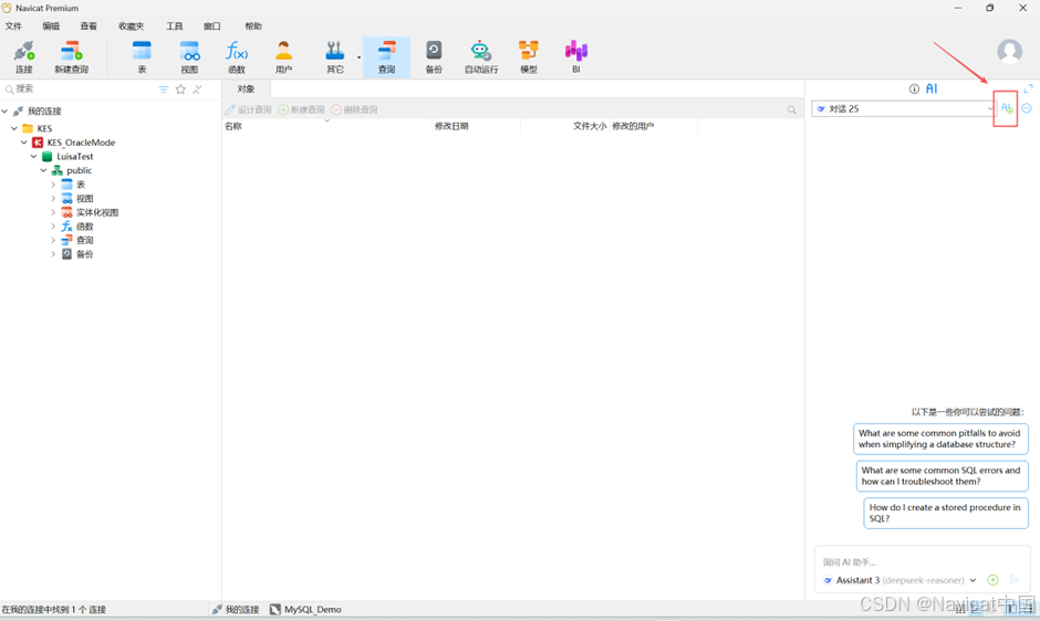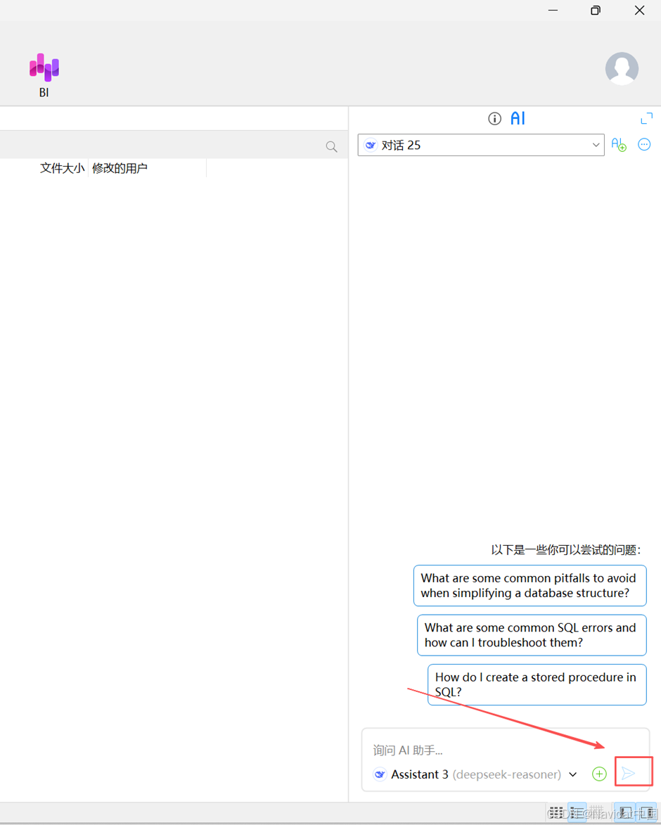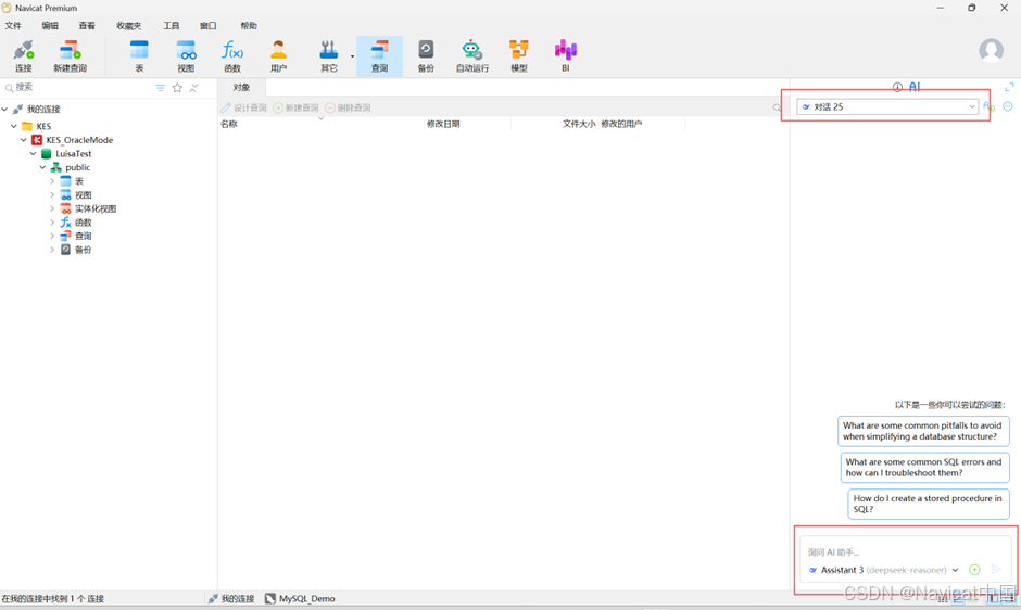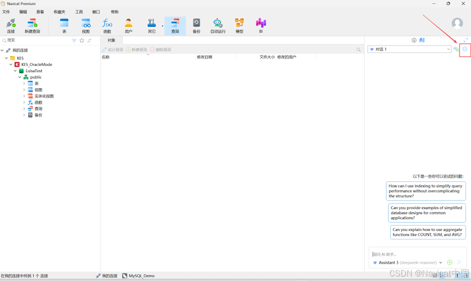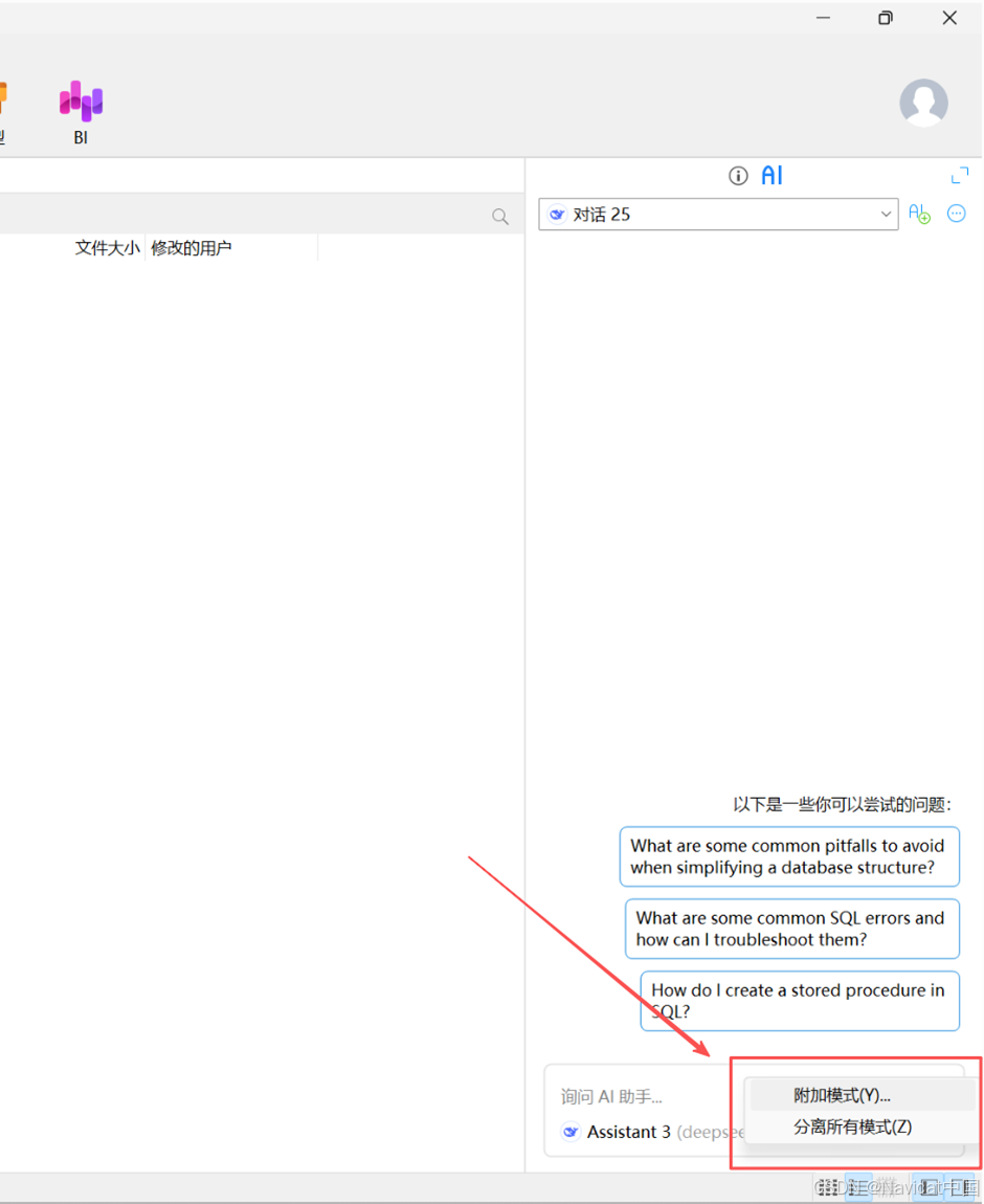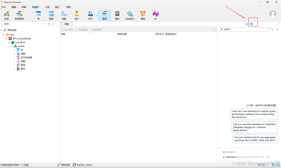 可以通过主窗口中的信息窗格访问 AI 助手。该功能与各种组件(包括查询、视图和函数)无缝集成,增强了用户互动,提高了工作效率。