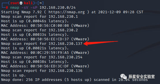 Nmap -sV -sP 192.168.230.0/24(-sV服务版本,-sP扫描存活主机)