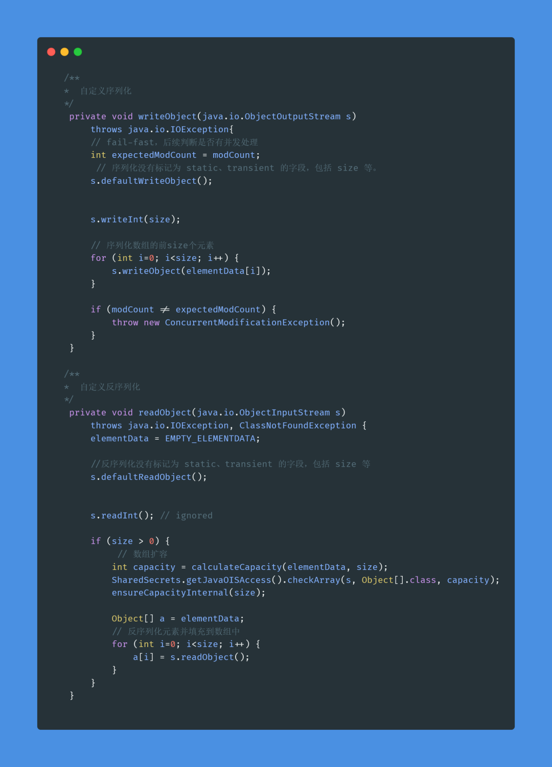 ArrayList通过两个方法readObject、writeObject自定义序列化和反序列化策略,实际直接使用两个流ObjectOutputStream
