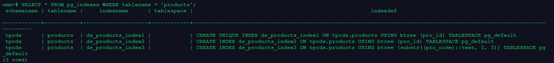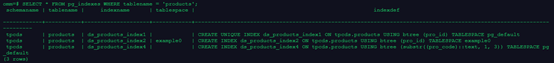 SELECT * FROM pg_indexes WHERE tablename = 'products';