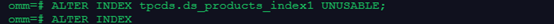 --设置索引1不可用ALTER INDEX tpcds.ds_products_index1 UNUSABLE;