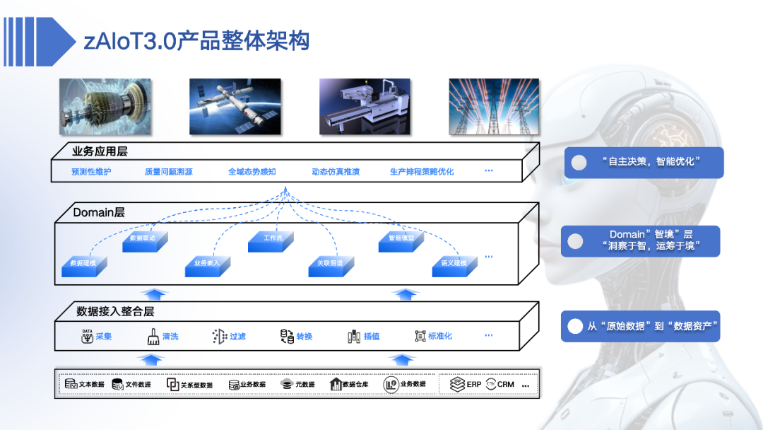 盖国强提到,云和恩墨在2023年初正式推出的zAIoT是一款深扎于军工与工业制造场景的数据智能平台。该产品以业务需求为导向,依托“数据接入整合层-智境(Domain)层-业务应用层”的三层架构,递进式地实现数据从“原始形态”到“业务价值”的转化。同时,通过AI技术打造通用的平台能力,zAIoT通过构建数据资产、算法模型、业务流程等要素,为顶层的SaaS化应用提供了支持。